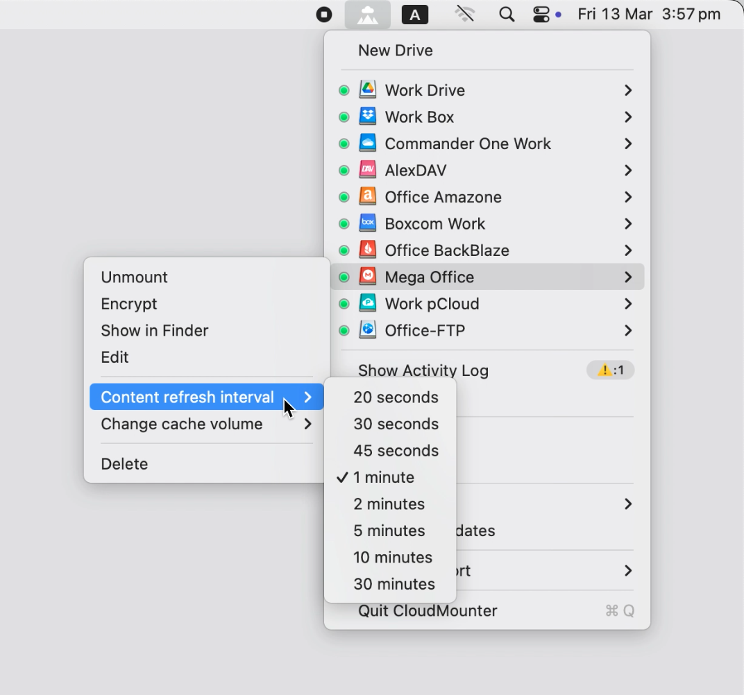- Change cache volume – lets you choose where CloudMounter stores cached data for your mounted cloud drives.