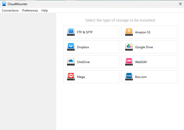 1. To mount Mega via CloudMounter for Windows, click the Mega icon in the new connection dialog.